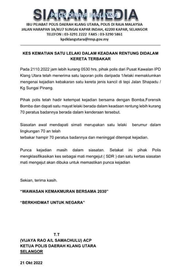 Polis juga masih menyiasat punca kebakaran, kes diklasifikasikan sebagai kematian mengejut (SDR). Polis juga meminta saksi awam yang menyaksikan insiden berkenaan supaya tampil membantu polis.