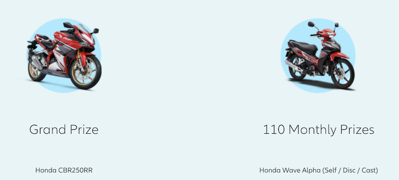 Dia membawa pulang sportbike Honda CBR250RR bernilai RM25,999. Selain itu, 110 unit Honda Wave Alpha menjadi hadiah bulanan sepanjang tempoh tiga bulan kempen berlangsung yang berakhir 31 Disember tahun lalu.