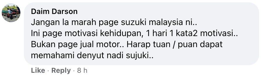 Ada peminat yang menyindir Facebook Suzuki Malaysia sebagai laman motivasi dan ucap selamat, serta tidak teringin hendak menjual motosikal. Ada pula pembaca beritahu, pengedar Suzuki Malaysia sekarang masih memiliki kontrak dengan Kawasaki dan perlu tunggu ditamatkan sebelum dapat menjual produk Suzuki.