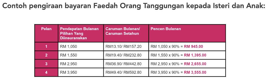 Antaranya faedah perubatan, hilang upaya sementara dan kekal, orang tanggungan, pengurusan mayat, elaun layanan sentiasa, faedah pinjaman pendidikan dan kemudahan pemulihan jasmani dan serta vokasional.