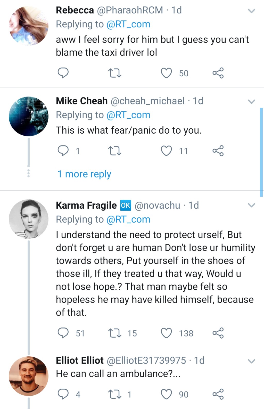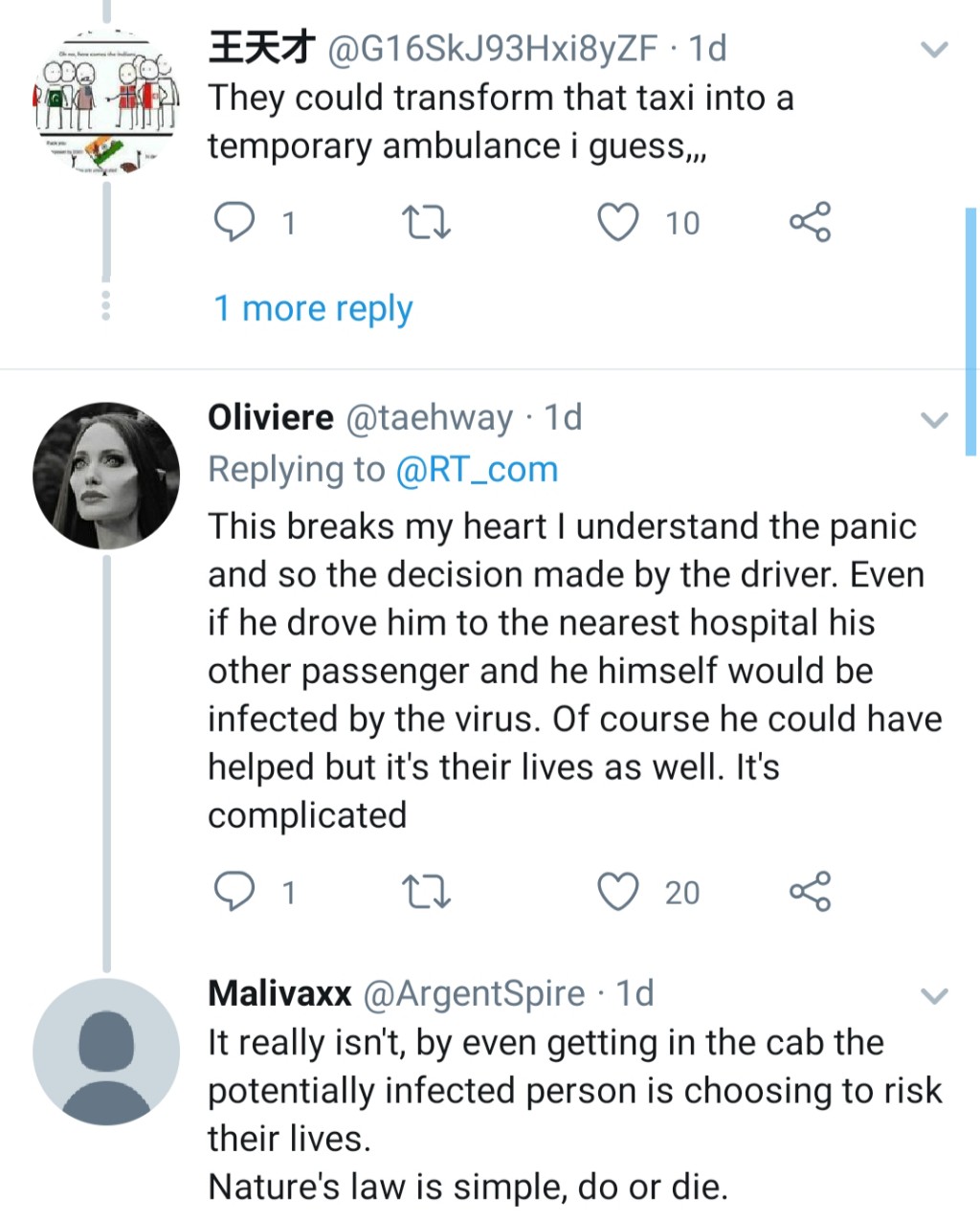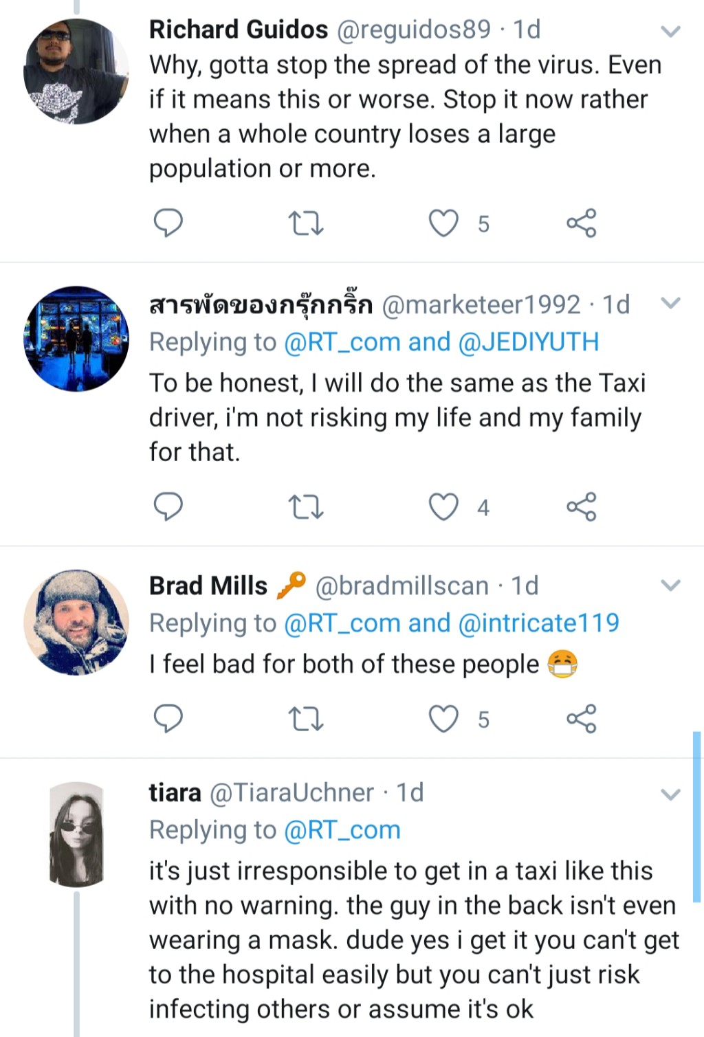 Ramai warga maya menyokong tindakan pemandu terbabit kerana wabak koronavirus sangat mudah berjangkit. Penumpang lelaki itu sepatutnya buat panggilan kecemasan supaya dia dapat dirawat. Ada juga yang mengecam tindakan pemandu itu kerana biadap dan tidak berperikemanusiaan.