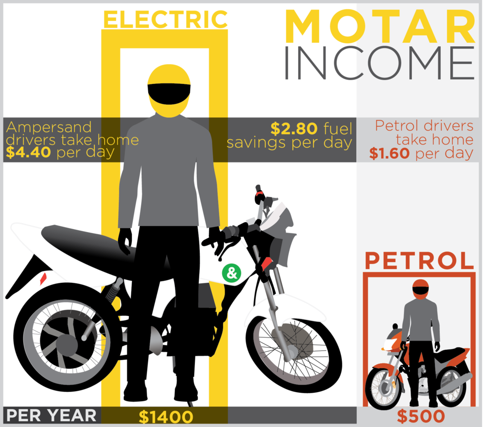 Motosikal elektrik Ampersand mampu ditunggang sejauh 65km dengan kelajuan maksimum 85km, manakala prestasi dihasilkan adalah setanding motosikal petrol konvensional bersesaran 125cc. Penggunaan e-motosikal untuk perkhidmatan teksi motor dijangka mengurangkan pencemaran emisi kenderaan sebanyak 75 peratus di Rwanda.