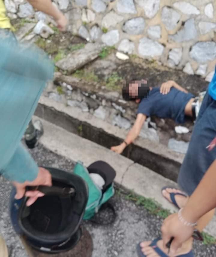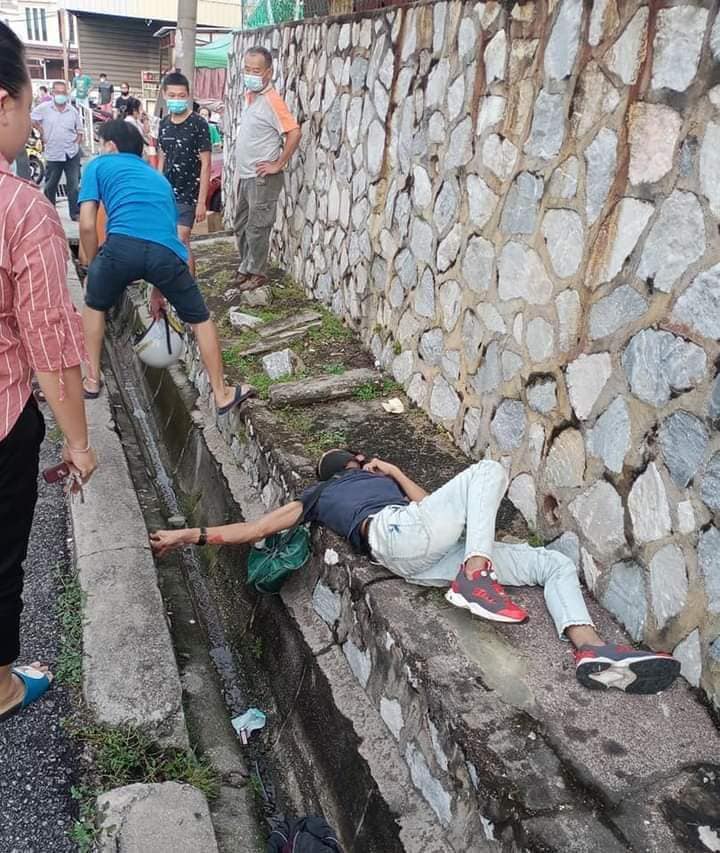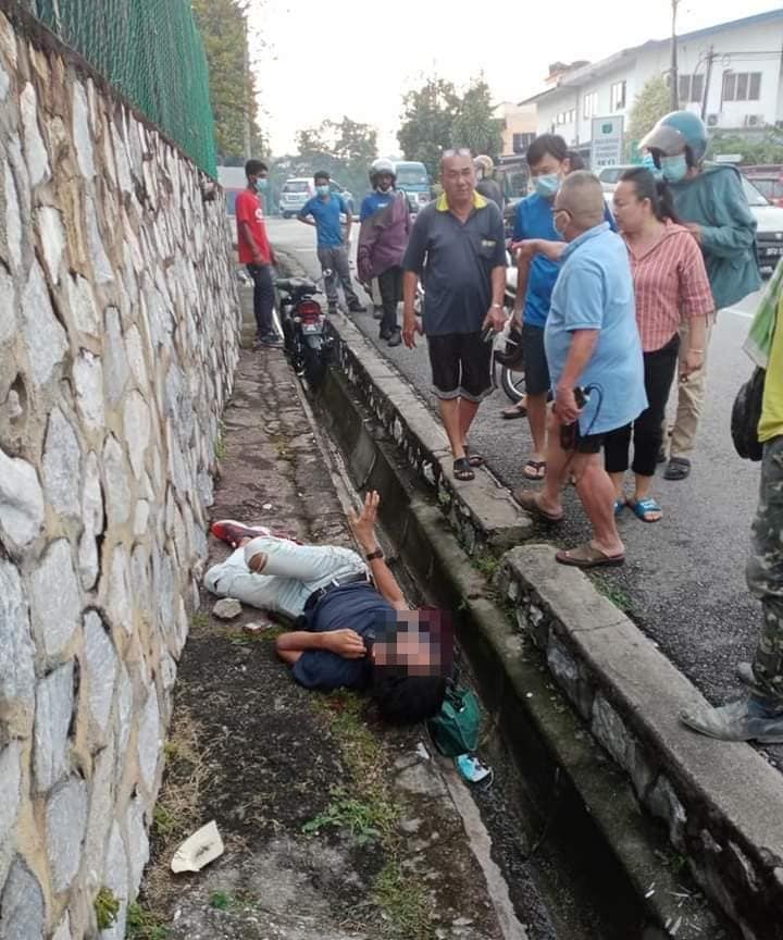 Orang ramai yang terdengar jeritan mangsa kemudian menangkap suspek yang tidak dapat ke mana-mana kerana mengalami kecederaan dan hanya terbaring kesakitan di tepi longkang.