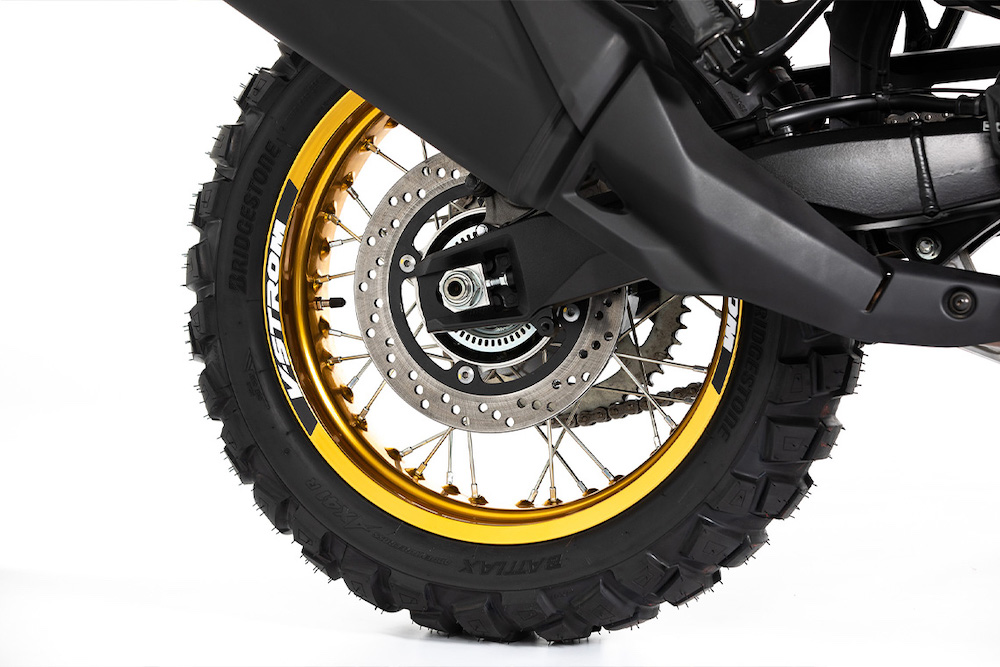 - Rim jejari depan 21 inci dengan profil tayar 90/90, belakang 17 inci saiz tayar 150/70. Jenis tayar digunakan Dunlop Trailmax Mixtour.