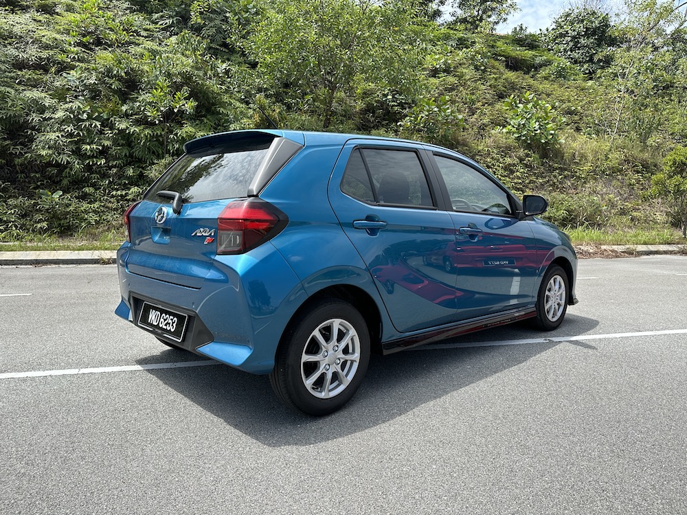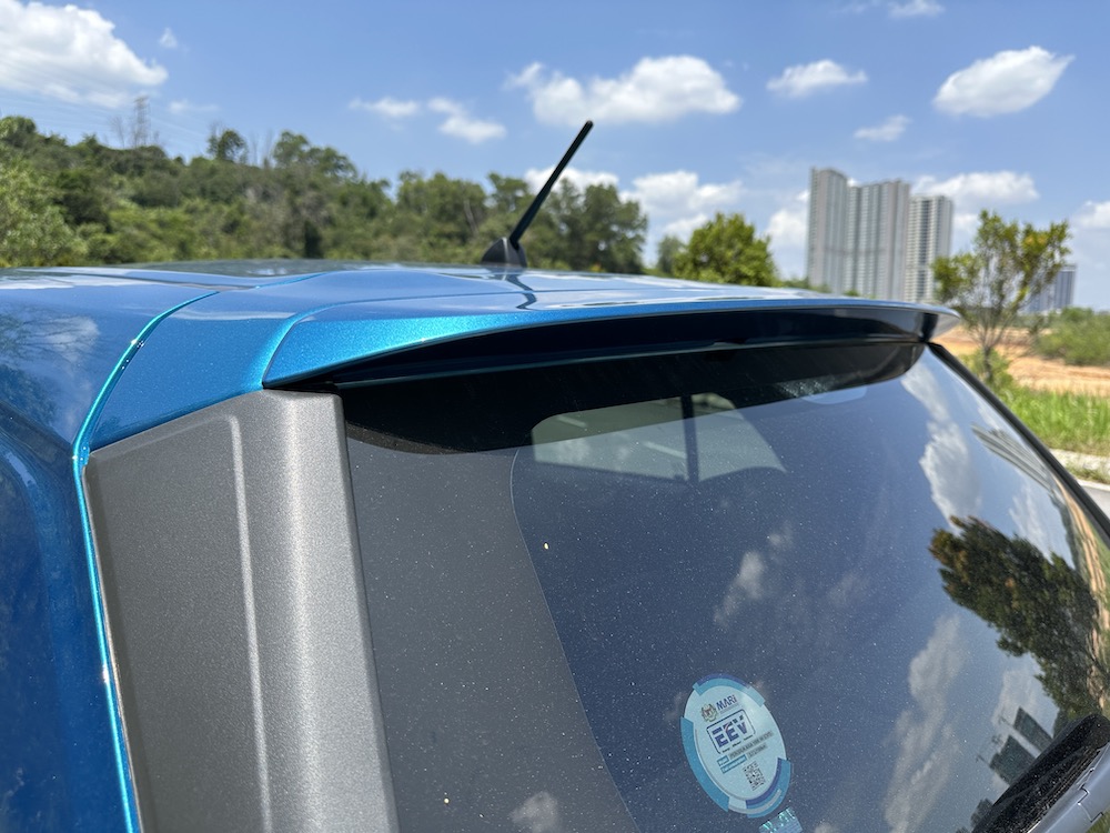 Bahagian belakang Axia X tiada spoiler, sekali gus mendedahkan penyembur air (lihat bulatan) pada atas cermin belakang. Sudah tentu penampilan AV lebih kemas dan sporty dengan kehadiran spoiler.