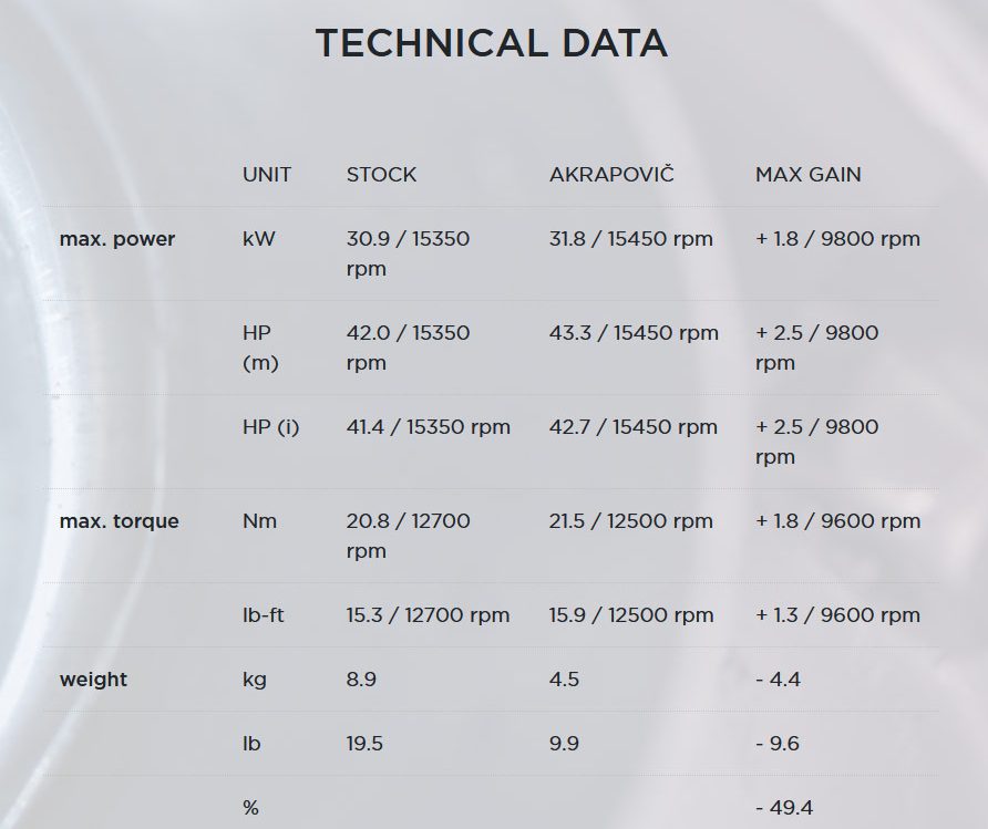 Sementara itu, walaupun Ninja ZX-25R masih belum diketahui spesifikasi mekanikal kerana belum dilancarkan, tetapi data daripada mesin dyno Akrapovic menunjukkan kuasa on-wheel sportbike Kawasaki itu ialah 42hp @ 15,350rpm dan tork 20.8Nm @ 12,700rpm (tidak diketahui mod digunakan).