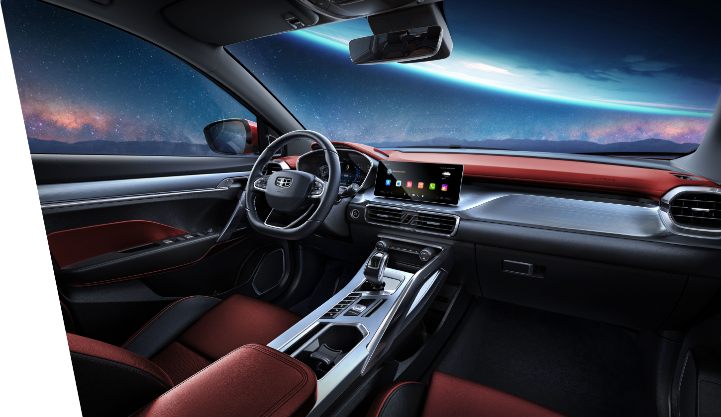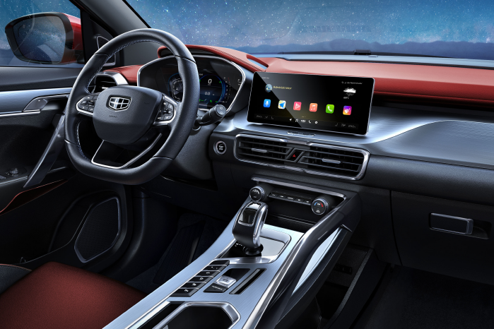 Juga sama antara Coolray dan X50. Coolray menggunakan unit infotainment skrin sentuh 10.25 inci jenis apung dengan sistem operasi GKUI. Jika diperhatikan lebih dekat, punat kawalan klimat (climate control) penyaman udara juga berubah posisi kiri ke kanan.
