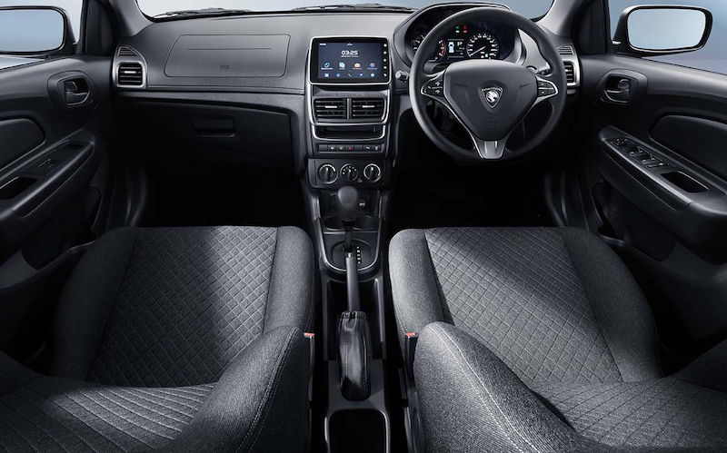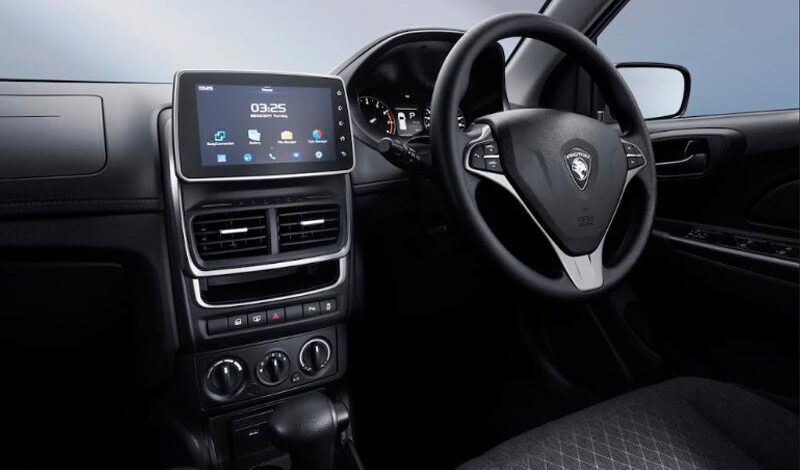 Kabin Saga Pakistan menggunakan tona hitam dengan aksen aluminium pada stereng, konsol tengah dan beberapa bahagian lain. Stereng Saga direka bulat yang disertakan butang kawalan audio dan panggilan telefon.