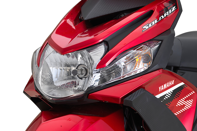 Ego Solariz pula hadir dengan lampu utama yang diapit dua lampu signal belok. Persamaan pada pandangan mata kasar fork hitam, rekaan cermin sisi dan tuil brek krom.