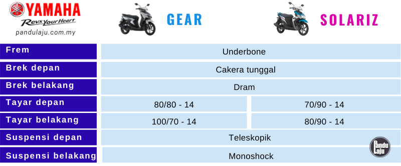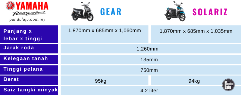 Jika diperhatikan, kedua-dua skuter itu menggunakan panel hitam di tempat sama sebagai tona kontras daripada panel berwarna. Grafik badan Ego Gear lebih minimalis berbanding EgoSolariz yang agak sofistikated. Tidak dilupakan logo Yamaha pada sisi panel depan Ego Gear, manakala Ego Solariz menggunakan teks Yamaha.