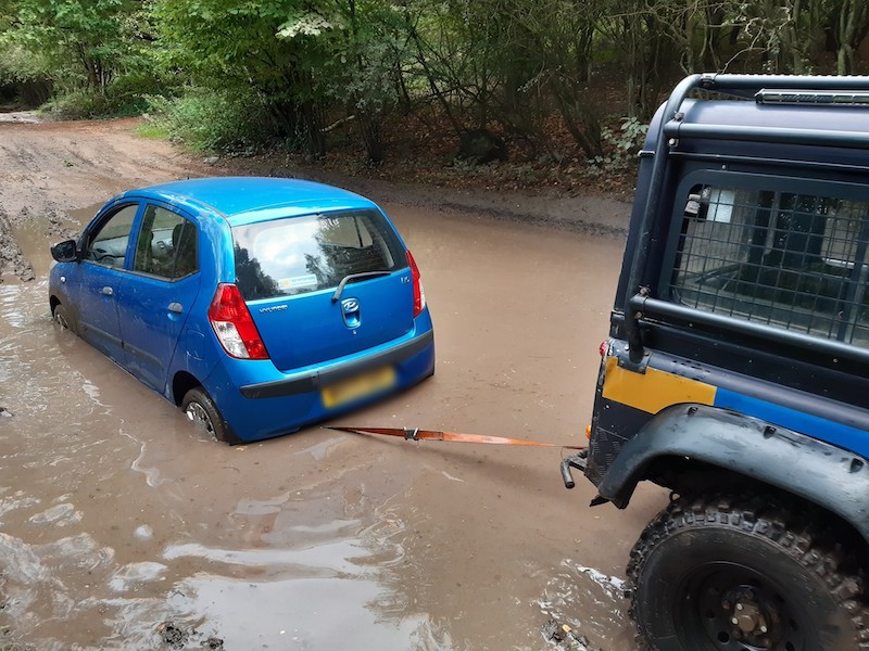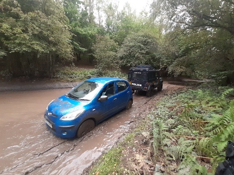 Pasukan Polis Kejiranan Mansfield Utara tiba di lokasi dengan sebuah Land Rover Defender dan membantu menunda keluar Hyundai i10 tersebut.