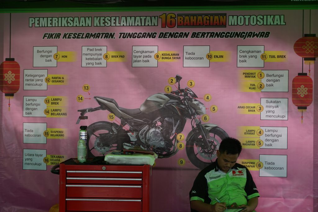 Kempen anjuran Kawasaki Motors Malaysia (KMM) itu dianjurkan di Plaza Tol Sungai Besi (arah selatan). Pengguna motosikal yang mendaftar untuk pemeriksaan motosikal percuma hari ini turut berpeluang mendapat helmet baru, atau menggantikan helmet sendiri yang sudah buruk, atau uzur. .