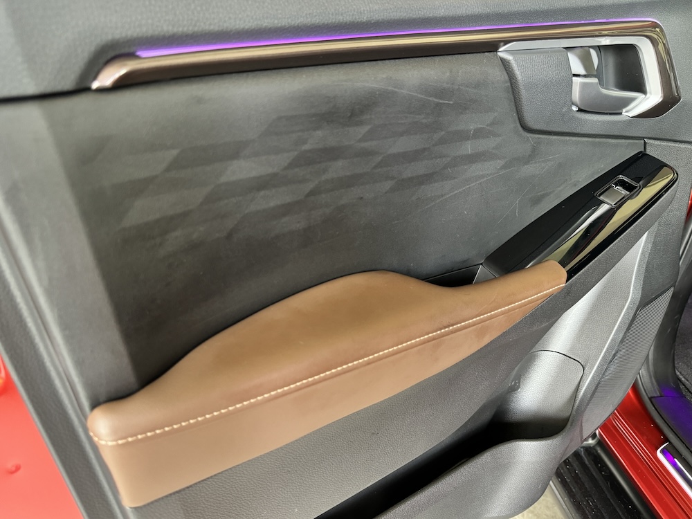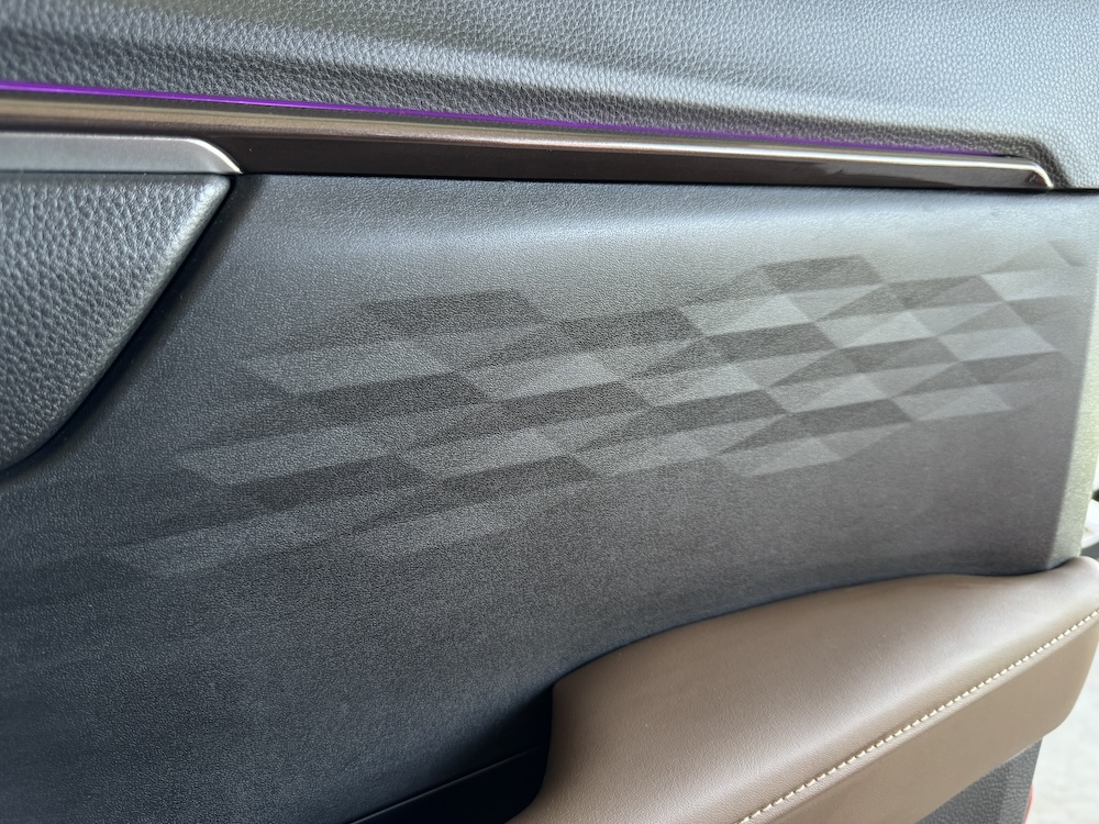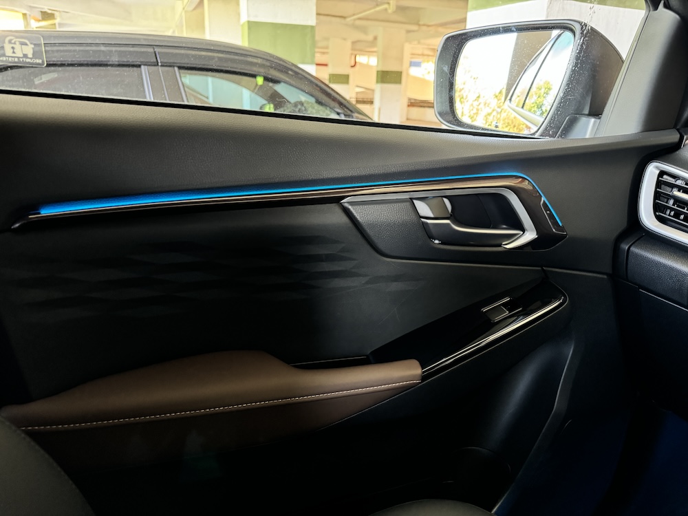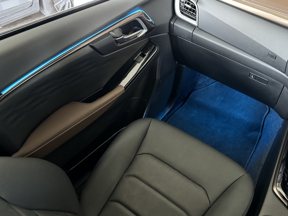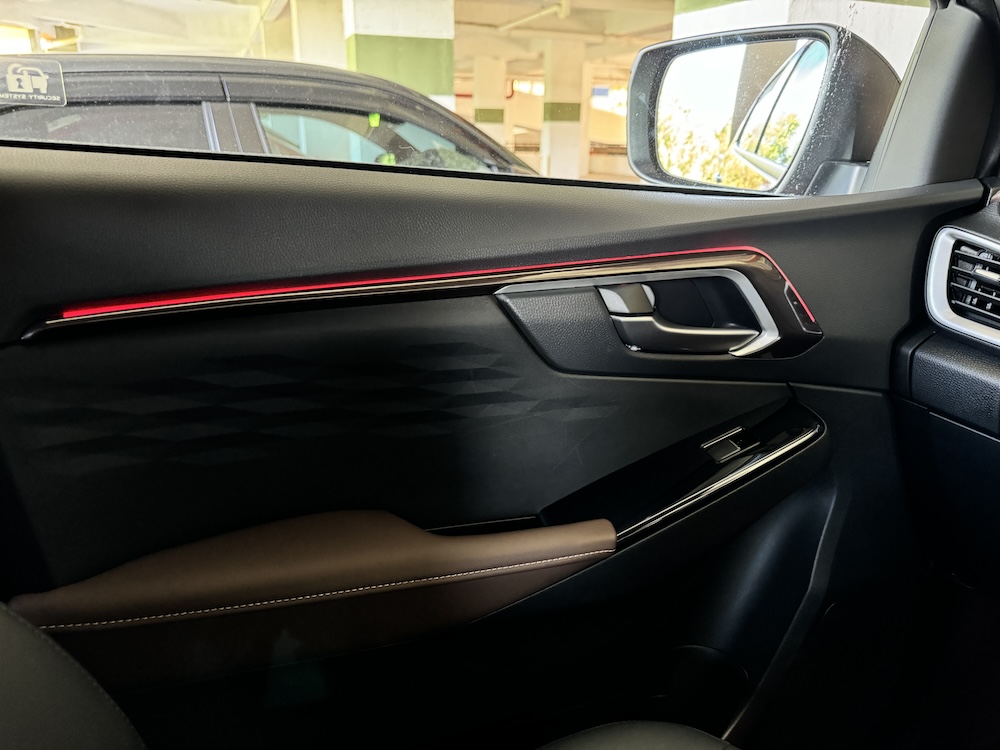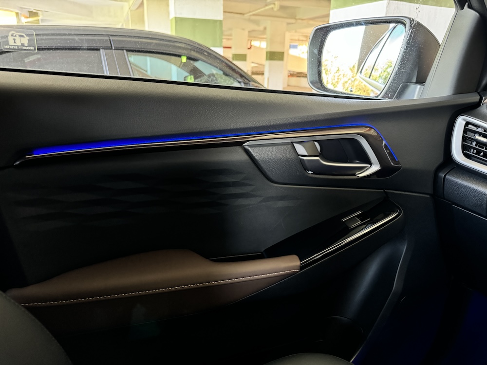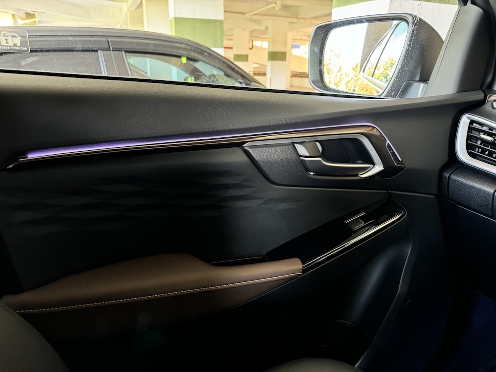 Pandangan ke panel pintu pula menyerlahkan elemen rekabentuk MIURA terbaharu dengan pencahayaan ambien multiwarna. Apabila pintu dibuka, LED pada plat calar (scuff plate) akan bercahaya (diposisikan di bawah).