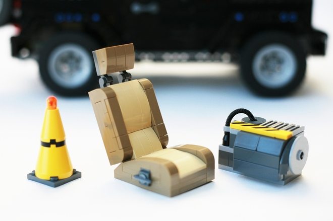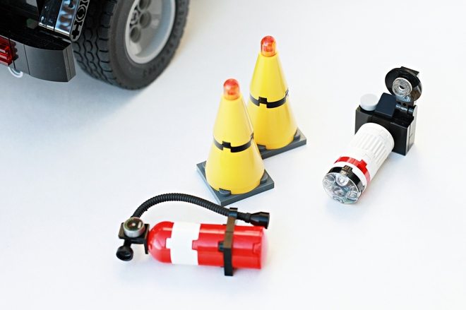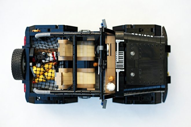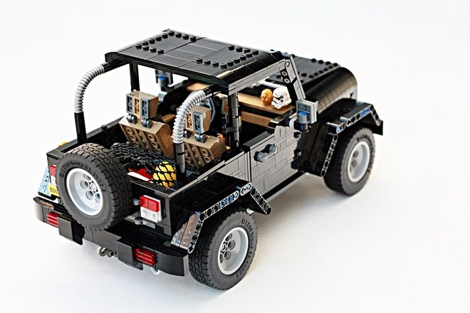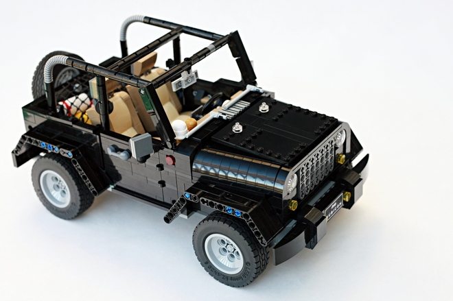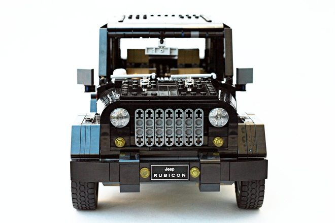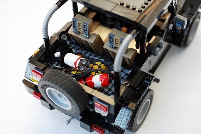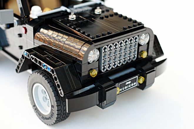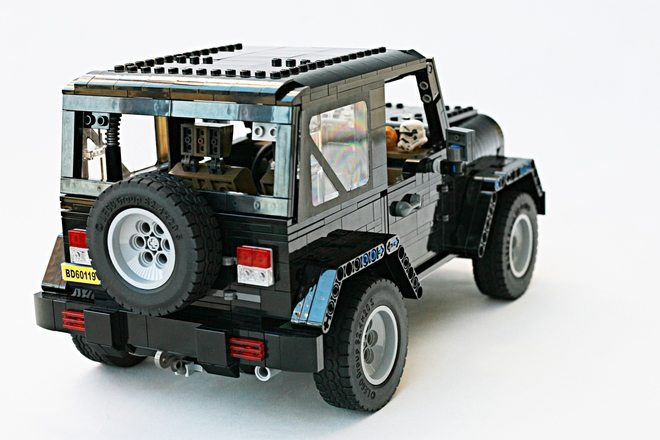 Lebih nampak lebih realistik, si pereka turut menambah nombor plat, cagak cangkuk tunda dan jaring simpanan untuk boleh digunakan untuk memuatkan aksesori penting Jeep Wrangler itu. Apa lagi mahu dikatakan, set Wrangler LEGO tersebut nyata dibikin dengan baik sekali dari segi perbandingan casis, saiz tayar, lekuk berlekuk, dan gril depan ikonik.