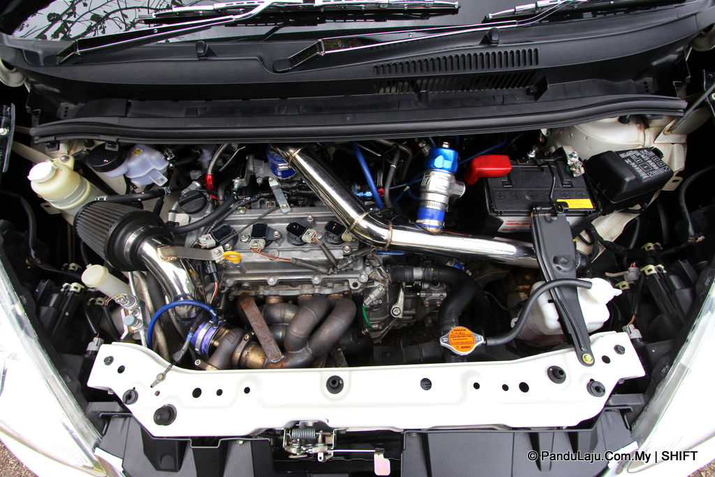 Udara sejuk dari intercooler Apexi kemudian disedut memasuki ruangan intake manakala udara berlebihan ditolak keluar melalui blow-off Turbosmart Super Sonic.