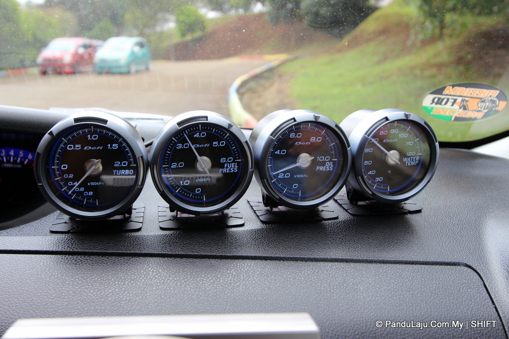 Begitu juga pada bahagian dalaman. Ruangan papan pemuka menempatkan beberapa meter bagi memantau perjalanan enjin seperti Defi 4 beradik (oil temp, boost, water temp, fuel press), RSM Apexi dan unit pemasa turbo Apexi.