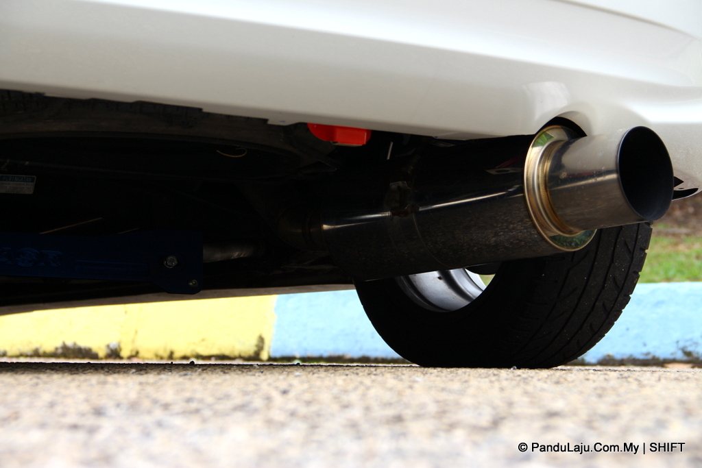 Gas karbon yang terhasil melalui pembakaran dalam kebuk kemudian ditolak keluar melalui banana rekaan kustom yang ditenggekkan bersama compgate Turbosmart serta down pipe stainless steel.
