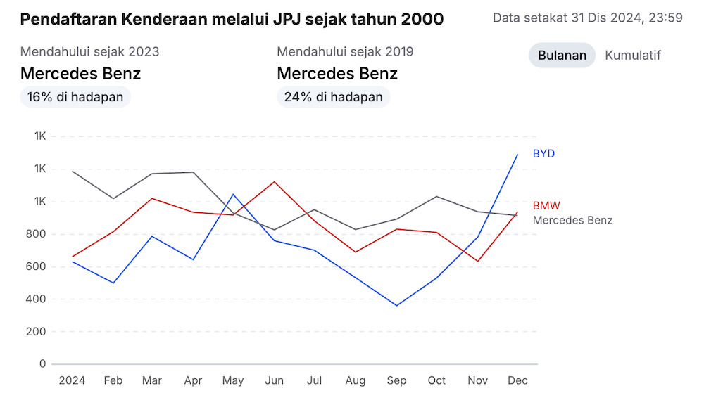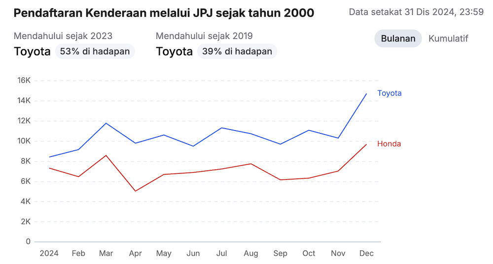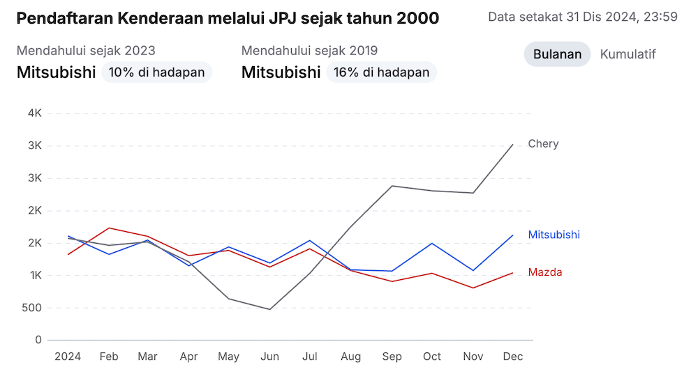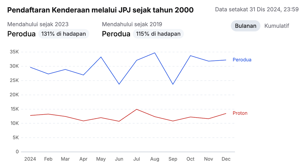 Berada di belakang ialah Proton dengan pendaftaran 147,587 unit kenderaan sepanjang tempoh 12 bulan lalu. Statistik terkumpul hingga 31 Disember 2024 itu dapat dilihat di laman web Data.gov.my.