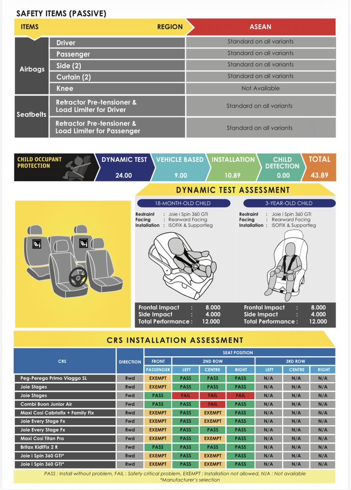 - Prestasi penuh dalam ujian impak hadapan dan sisi untuk kanak-kanak 18 bulan dan 3 tahun