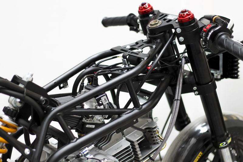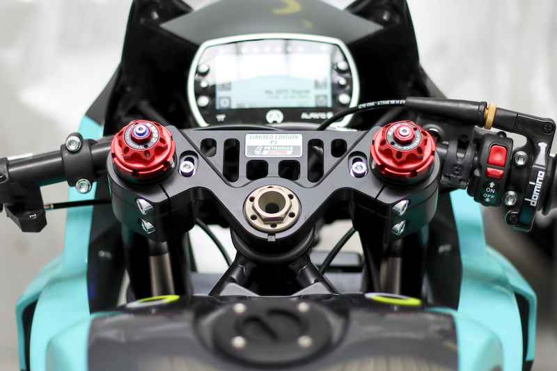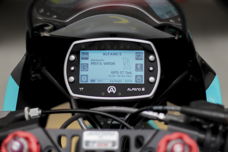 - Ada plat nombor siri pada pengikat tripel hendal. Panel meter digital Alfano T6 mampu merekod rev enjin (rpm), halaju, kedudukan di trek dan masa lap selain memaparkan maklumat tunggangan.