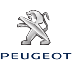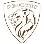 Imej dipaparkan ialah kepala singa menghadap ke kiri dengan mulut terbuka dan diletakkan dalam perisai, manakala tulisan 'PEUGEOT' tertera atas imej haiwan karnivor tersebut.