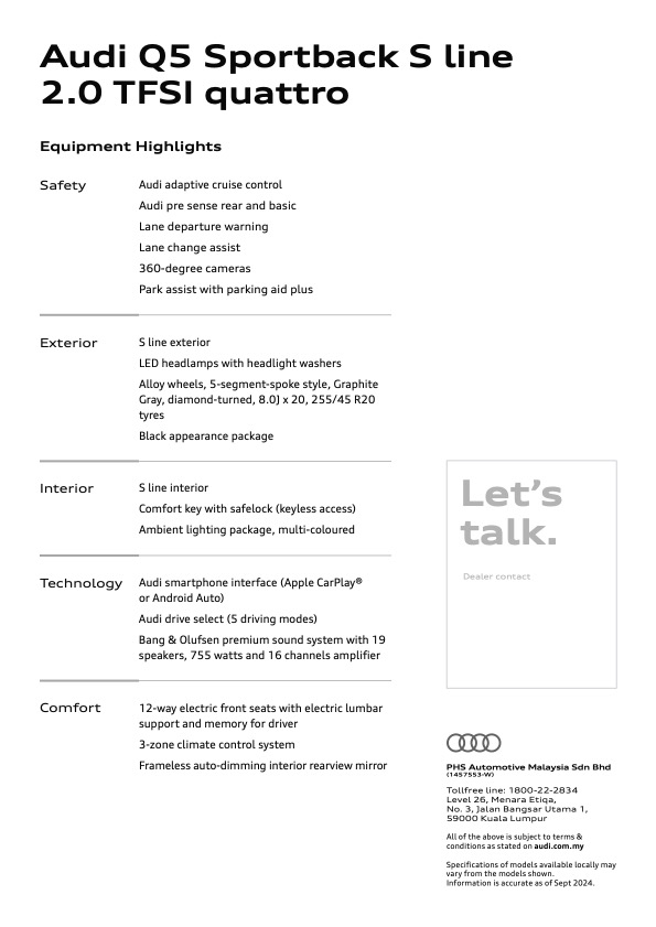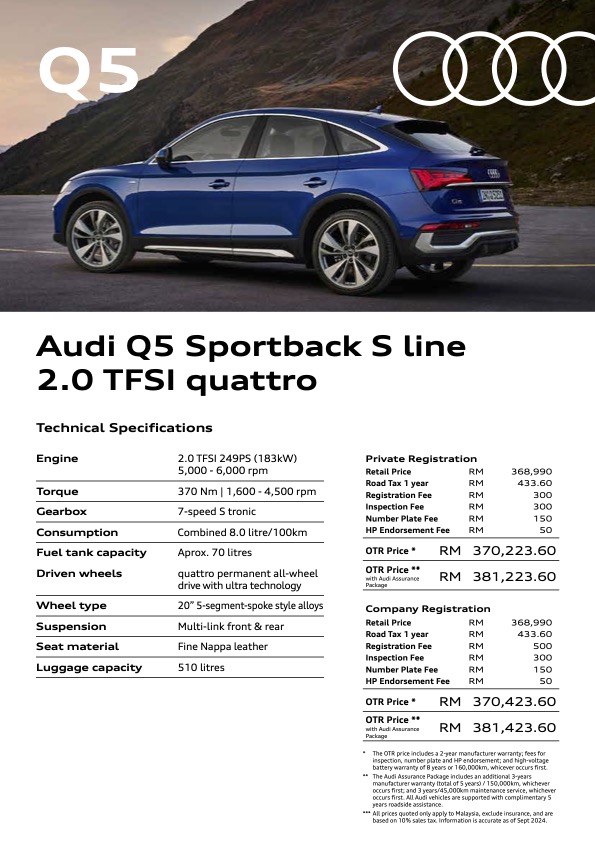 PENGEDAR rasmi kenderaan Audi di Malaysia, PHS Automotive Malaysia (PHSAM) mengumumkan harga terkini untuk kenderaan utiliti sukan (SUV) Audi Q5 Sportback iaitu RM368,990.