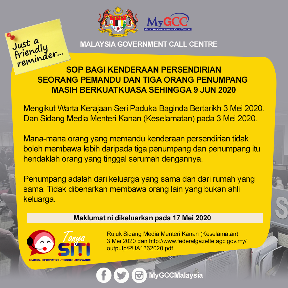 Seperkara lagi, syarat empat orang untuk satu kenderaan persendirian, termasuk pemandu adalah masih sah berkuat kuasa sepanjang tempoh PKPB hingga 9 Jun nanti. Penumpang mesti daripada ahli keluarga sama dan dari rumah yang sama, serta bukan orang lain selain ahli keluarga.