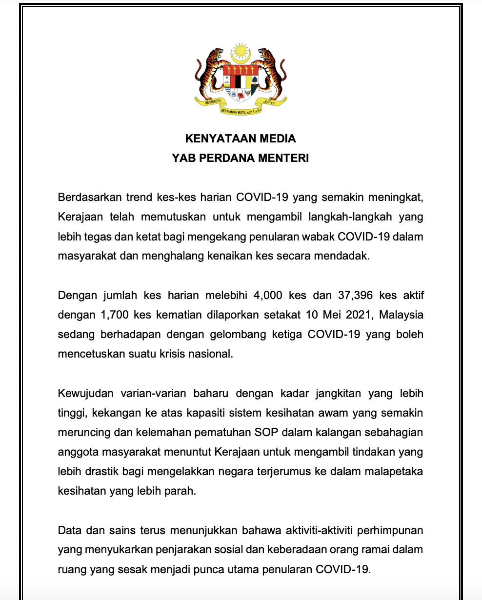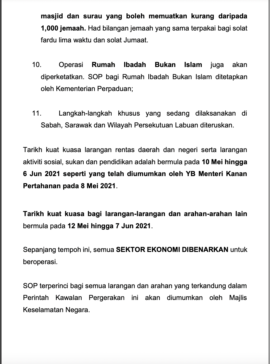 - Tarikh kuat kuasa bagi larangan-larangan dan arahan-arahan lain bermula pada 12 Mei hingga 7 Jun 2021.