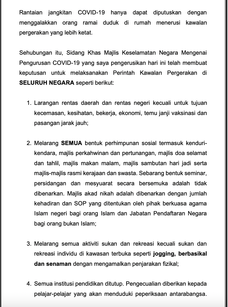 - Tarikh kuat kuasa larangan rentas daerah dan negeri serta larangan aktiviti sosial, sukan dan pendidikan adalah bermula pada 10 Mei hingga 6 Jun 2021 seperti yang telah diumumkan oleh Menteri Kanan Pertahanan pada 8 Mei 2021.