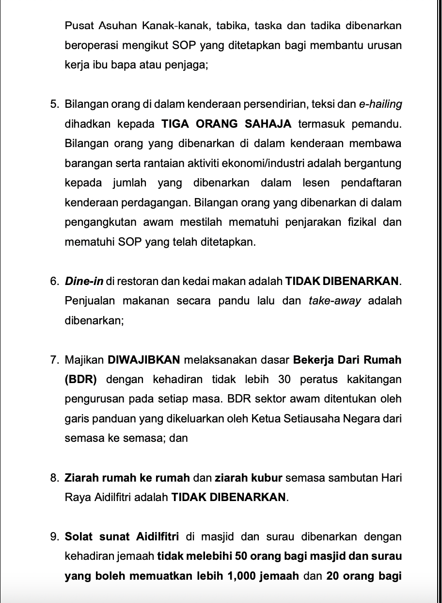 - Majikan diwajibkan melaksanakan dasar Bekerja Dari Rumah (BDR) dengan kehadiran tidak lebih 30 peratus kakitangan pengurusan pada setiap masa.