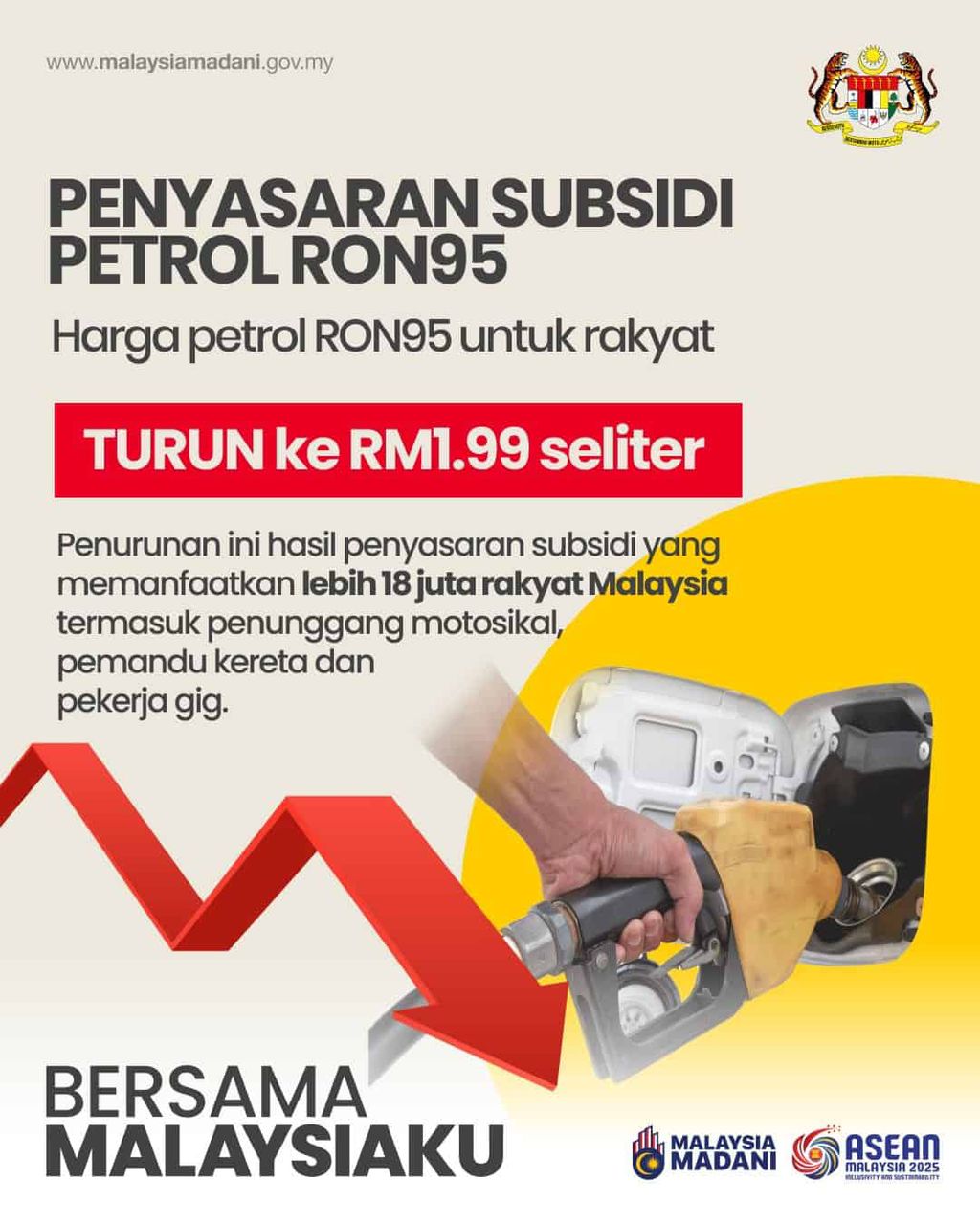 KERAJAAN memutuskan menurunkan harga petrol RON95 kepada RM1.99 seliter menjelang akhir September ini sebagai sebahagian pelaksanaan penyasaran subsidi bahan api.