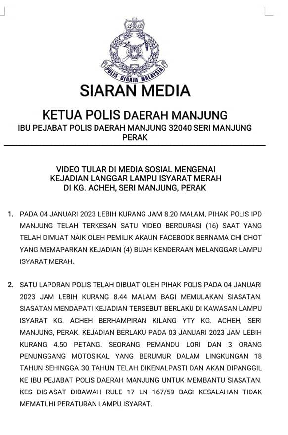 POLIS akan memanggil tiga penunggang motosikal dan seorang pemandu lori untuk membantu siasatan berikutan satu video tular aksi melanggar lampu isyarat merah di Persimpangan Kampung Acheh, Seri Manjung di Lumut, Perak.