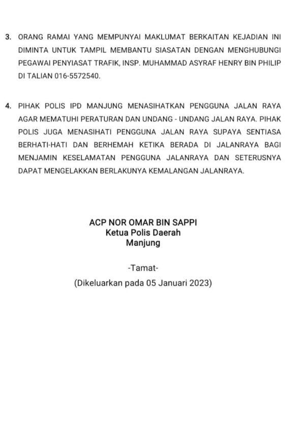 Ketua Polis Daerah Manjung, Asisten Komisioner Nor Omar Sappi berkata, semua individu terlibat sudah dikenal pasti dan akan dipanggil ke Ibu Pejabat Polis Daerah (IPD) Manjung disiasat.