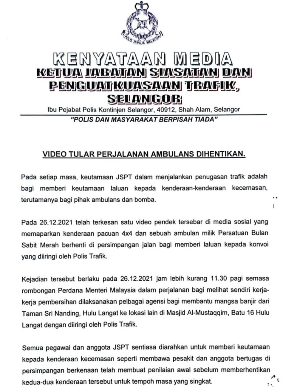 Selepas konvoi PM melepasi jalan itu, anggota trafik turut mengambil langkah segera memberi keutamaan kepada ambulans dan kenderaan Bulan Sabit Merah.