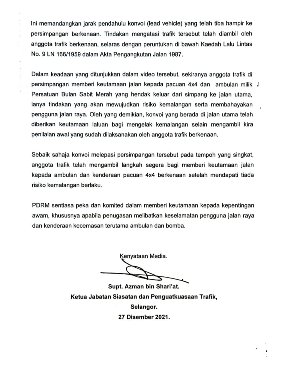 Tindakan itu dibuat kerana jarak konvoi sudah tiba sudah tiba terlebih dahulu ke persimpangan tersebut yang mana tindakan diambil anggota trafik adalah selaras peruntukan di bawah Kaedah Lalu Lintas No.9 LN 166/1959 dalam Akta Pengangkutan Jalan 1987.
