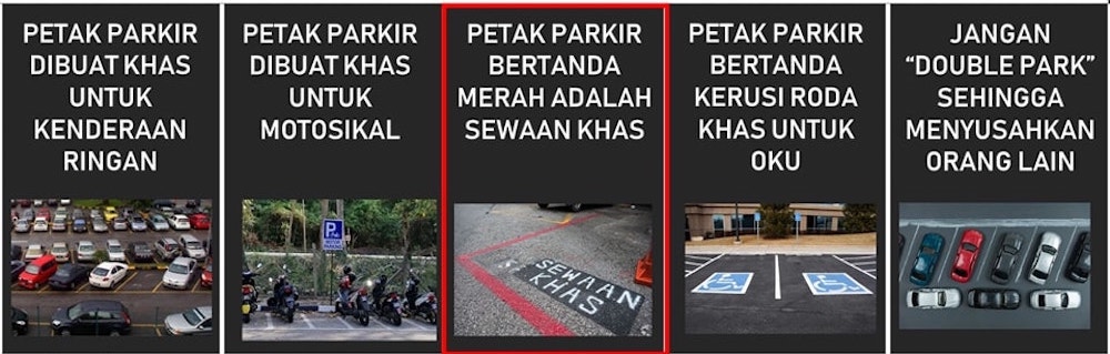 Dalam perkongsian itu, PDRM turut memaparkan foto cara betul meletakkan kenderaan dalam lot parkir, termasuk menerangkan beberapa jenis kawasan parkir yang ada di Malaysia.