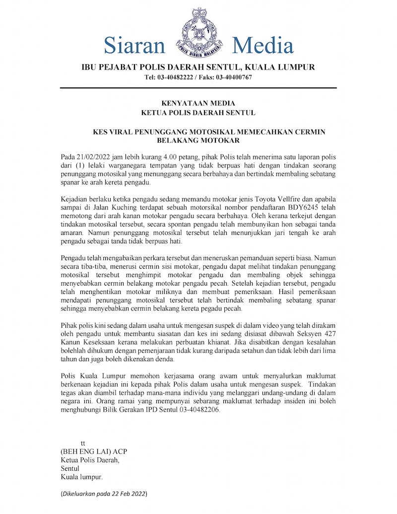 - Seorang lelaki, juga pemandu Toyota Vellfire, membuat laporan polis mendakwa seorang penunggang motosikal melempar sepana hingga memecahkan cermin belakang.