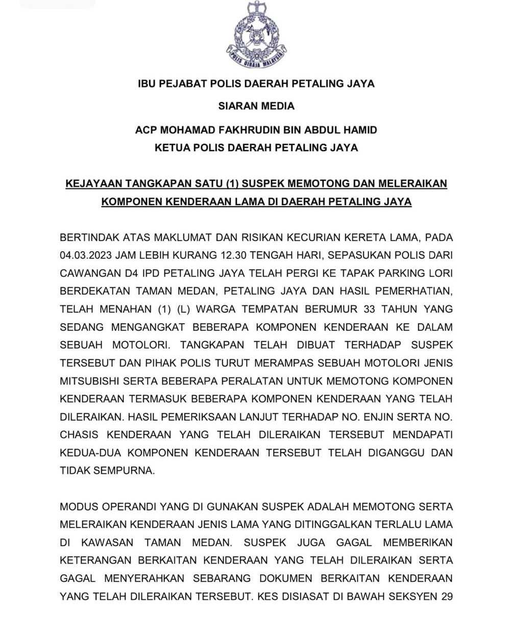 Semasa ditahan, suspek tersebut sedang mengangkat beberapa komponen kenderaan ke dalam sebuah lori. Polis turut merampas sebuah lori jenis Mitsubishi serta beberapa peralatan untuk memotong komponen kenderaan termasuk beberapa komponen kenderaan yang sudah dileraikan.”