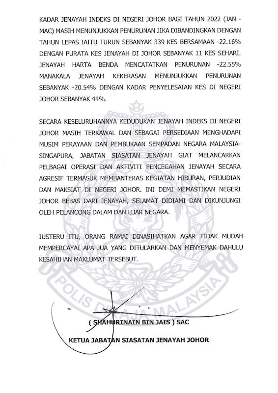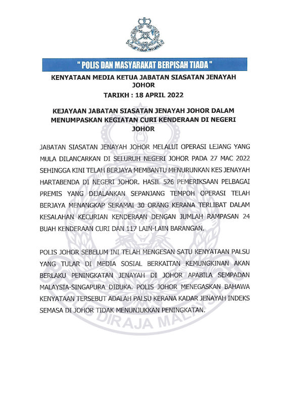 Polis Johor sebelum ini mengesan satu kenyataan palsu tular di media sosial berhubung kemungkinan berlaku peningkatan jenayah apabila sempadan Malaysia-Singapura dibuka. Polis Johor ingin menegaskan kenyataan tersebut adalah palsu.