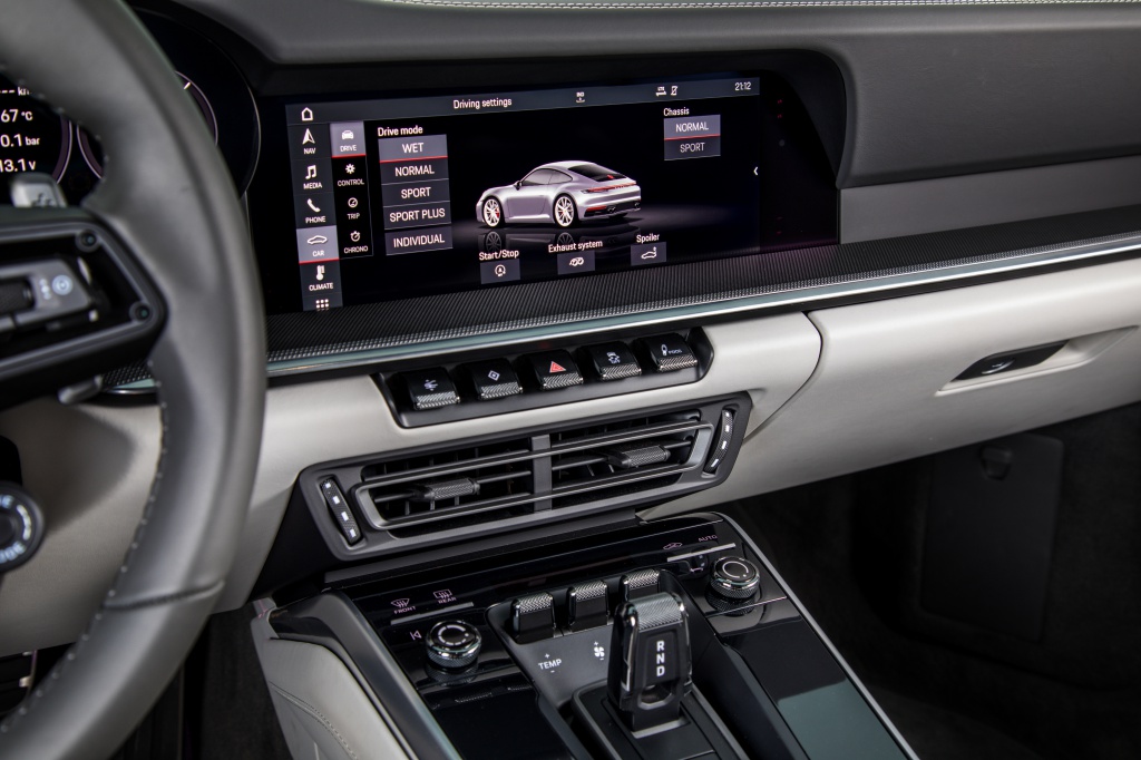 Unit infotainment dengan skrin sentuh 10.9 inci di konsol tengah didatangkan bersama antaramuka Porsche Communication Management (PCM). Di bawah, ada lima butang untuk akses kepada keperluan pemanduan dan fungsi casis.