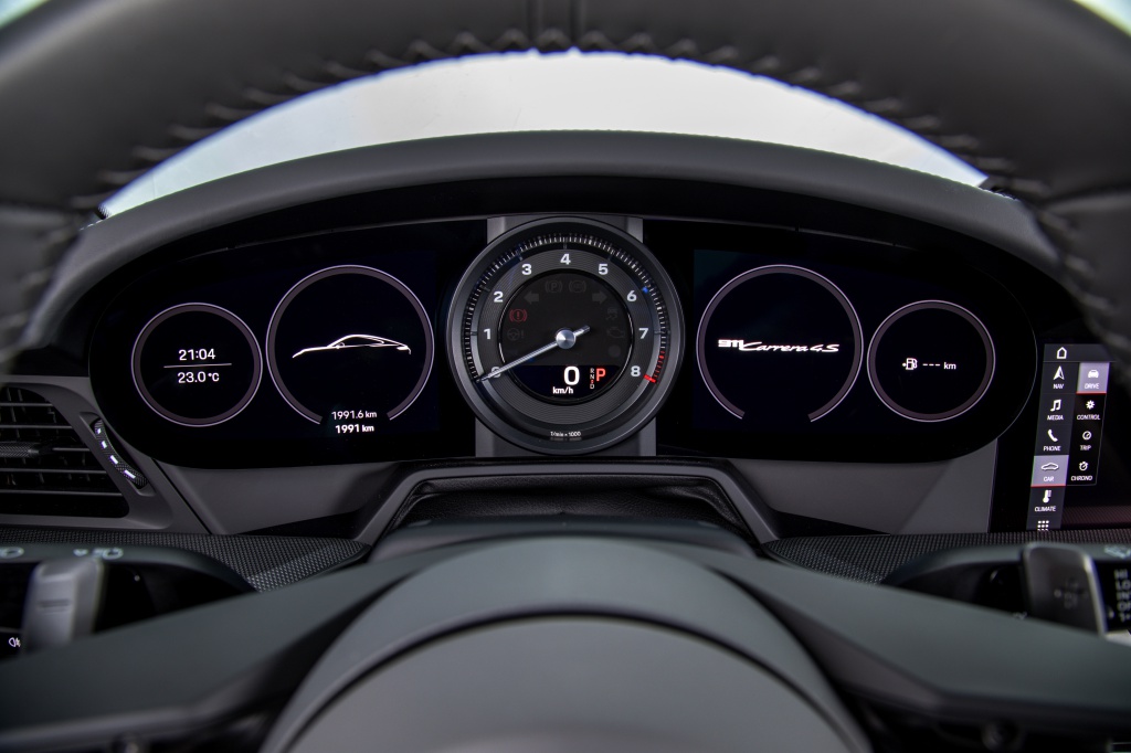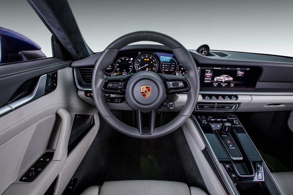 Masuk ke dalam kabin, papan pemuka menggabungkan elemen tradisional dan teknologi terkini yang diserlahkan menerusi rekabentuk halus dan instrumen tersembunyi, diilhamkan daripada empat generasi 911 terdahulu. Kluster meter 7 inci tanpa bingkai diserlahkan menerusi padanan rev analog di tengah yang diapit dua lagi informasi digital lain.