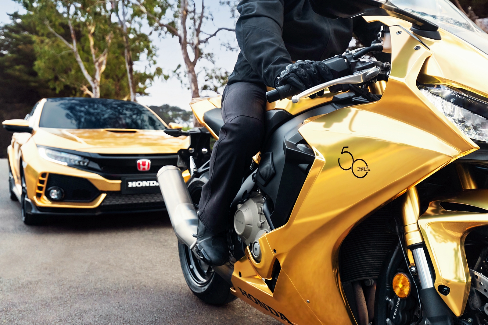Bagi meraikan ulang tahun setengah abad tersebut, Honda Australia menampilkan projek khas melibatkan model prestasi ikonik jenama itu. Projek tersebut ringkas saja, tetapi berimpak tinggi, iaitu membalut kenderaan dan produk Honda dengan pelekat krom keemasan.