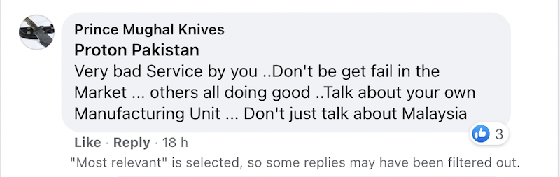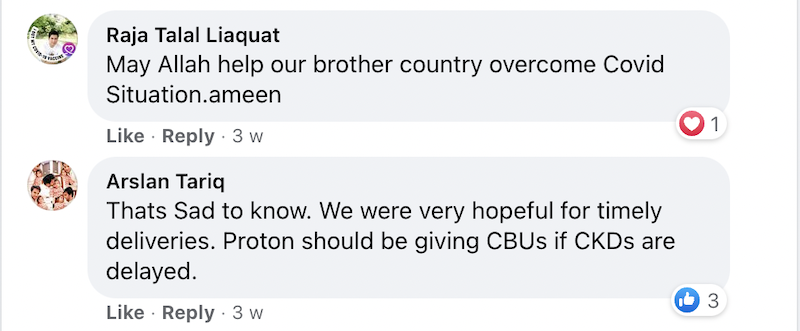 Beberapa netizen meluahkan rasa kecewa dan marah di Facebook Proton Pakistan selepas dimaklumkan perlu menunggu lebih lama untuk menerima produk CKD Proton.