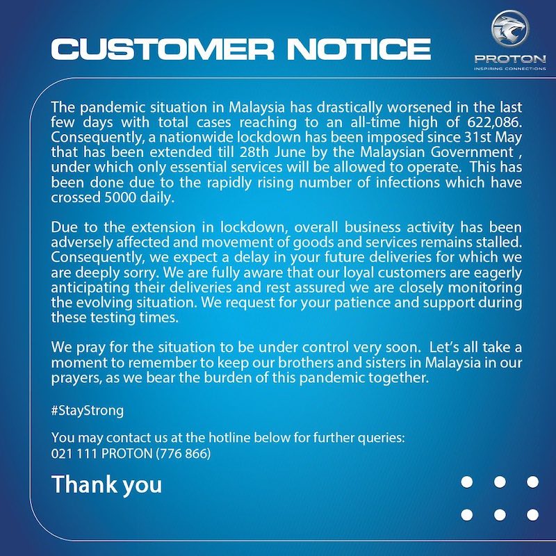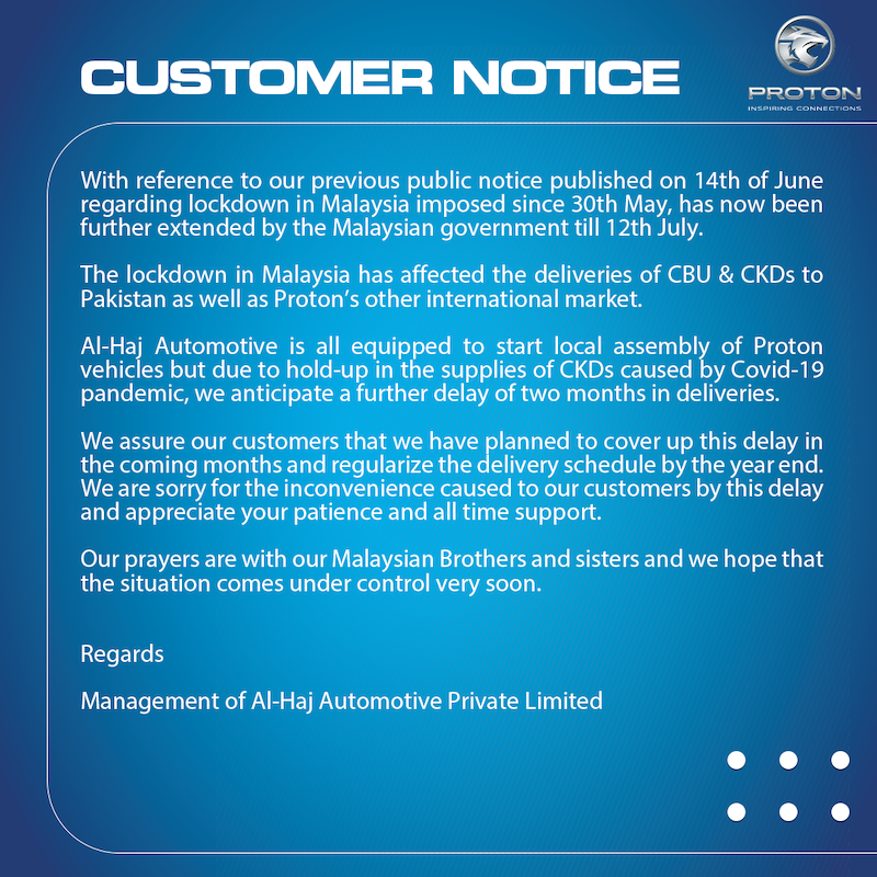 Proton Pakistan menjelaskan kepada peminat dan pelanggan di situ Malaysia terpaksa mengambil tindakan lockdown gara-gara peningkatan pandemik Covid-19 .