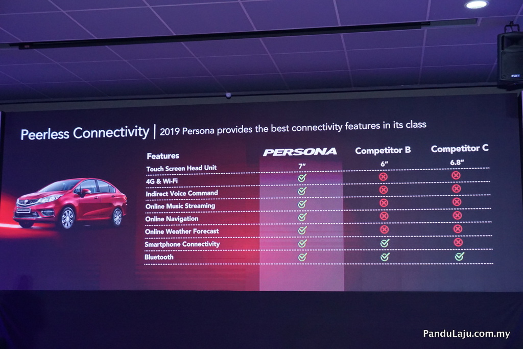 Lebih menarik, unit infotaiment Proton Persona (2019) facelift turut diberikan nafas baharu menerusi paparan skrin berwarna yang dibangunkan Proton dan ECARX dengan ciri konektiviti, termasuk fungsi arahan suara ‘Hi Proton’, sama seperti X70 dan Iriz 2019. Ia sekaligus menjadikan Proton Persona (2019) facelift sebagai sedan segmen-B pertama Proton yang memiliki ciri sedemikian.