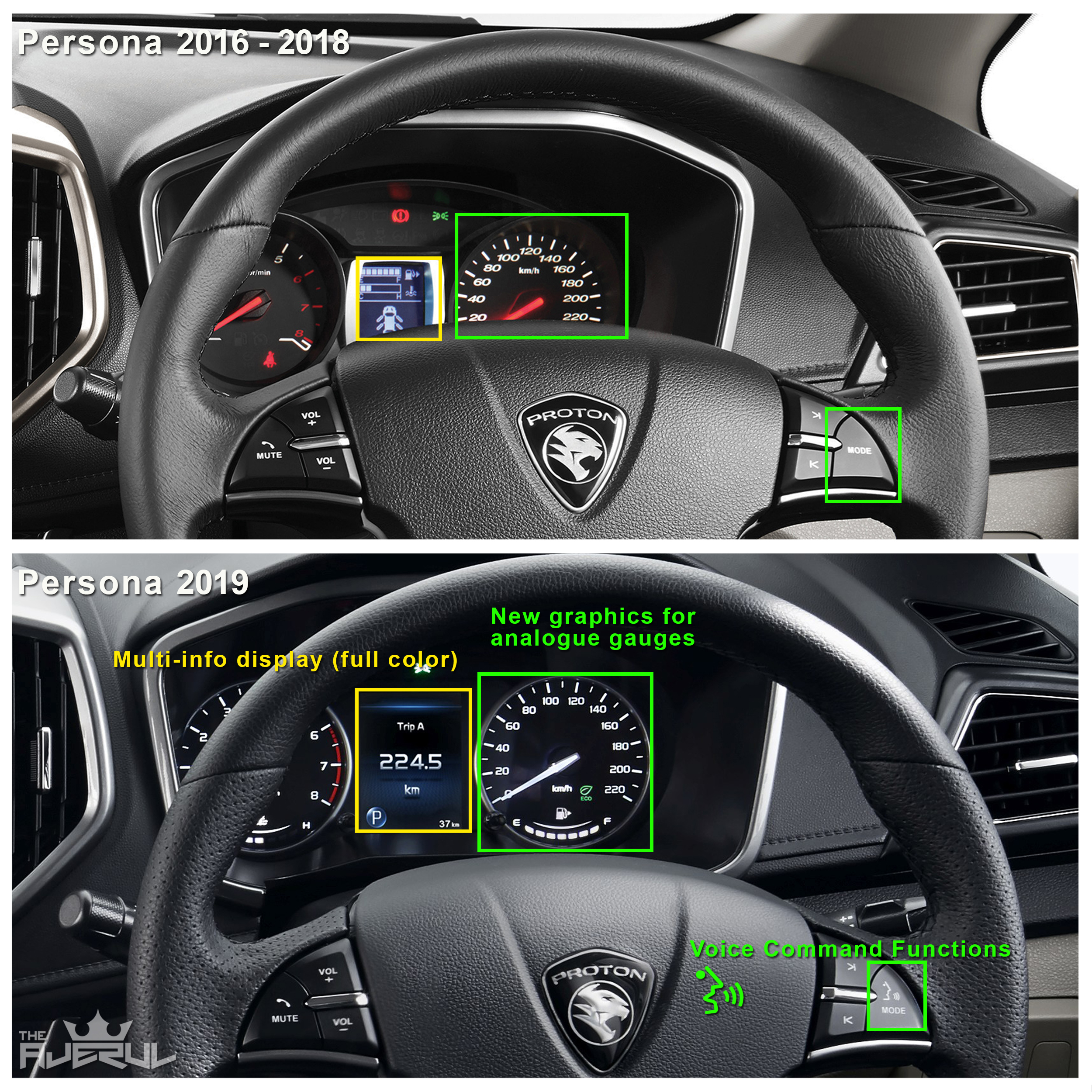 1. Rekabentuk stereng masih sama, tapi Persona baharu dipasangkan kulit lelubang pada kawasan genggaman. 2. Grafik baharu untuk spidometer dan takometer. 3. Ada Paparan Multiinfo (MID) warna penuh. 4. Butang kawalan ‘Mode’ di kanan stereng digantikan dengan butang ‘Voice Command’ untuk arahan suara ‘Hi Proton’.