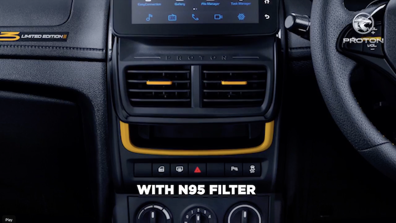 - Didatangkan dengan lampu siang (DRL) LED pada bampar depan, spoiler kecil pada but, rim aloi 15 inci, stereng dengan butang kawalan, unit infotainmen skrin sentuh 7 inci, kamera undur dan akses sambungan telefon pintar.