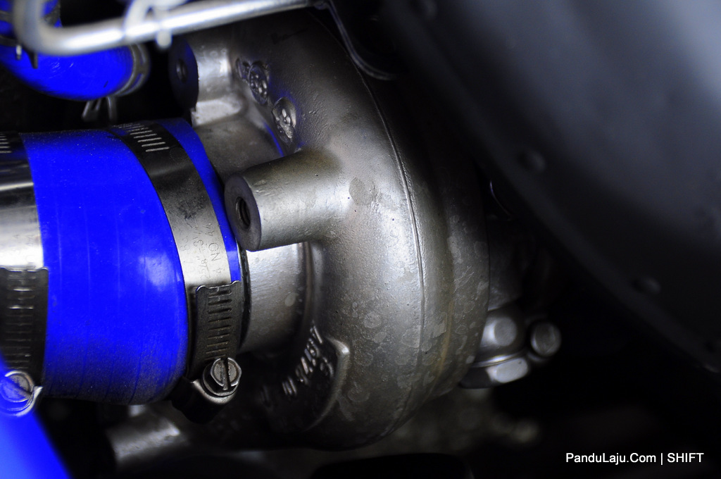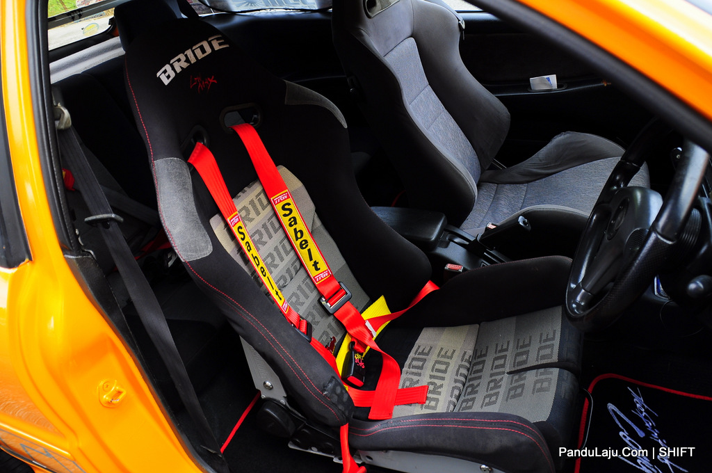 Jika enjin sudah ‘power’, aspek keselamatan juga harus dipertingkatkan. Oleh demikian, pemilik jentera memasang set suspensi boleh laras Mines HLSH Body Shift, bar 4-point Ultra Racing di bahagian depan serta 2-point di belakang.