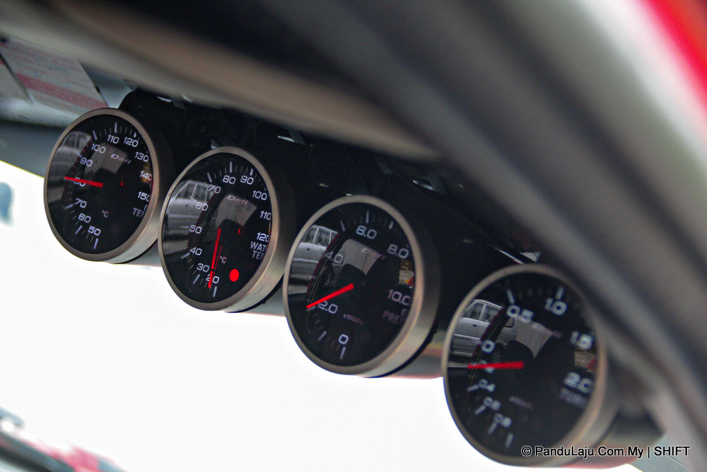 Bagi memantau perjalanan enjin, empat unit meter Defi dipasang pada bahagian papan pemuka beserta seunit meter Apexi RSM.