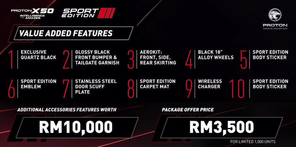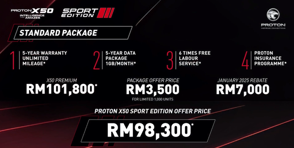 Dengan rebat ditawarkan itu, Proton X50 Sport Edition 2025 ini memberikan nilai yang sangat menarik kepada mereka yang mahu memiliki kenderaan dengan penampilan dan prestasi sporty.